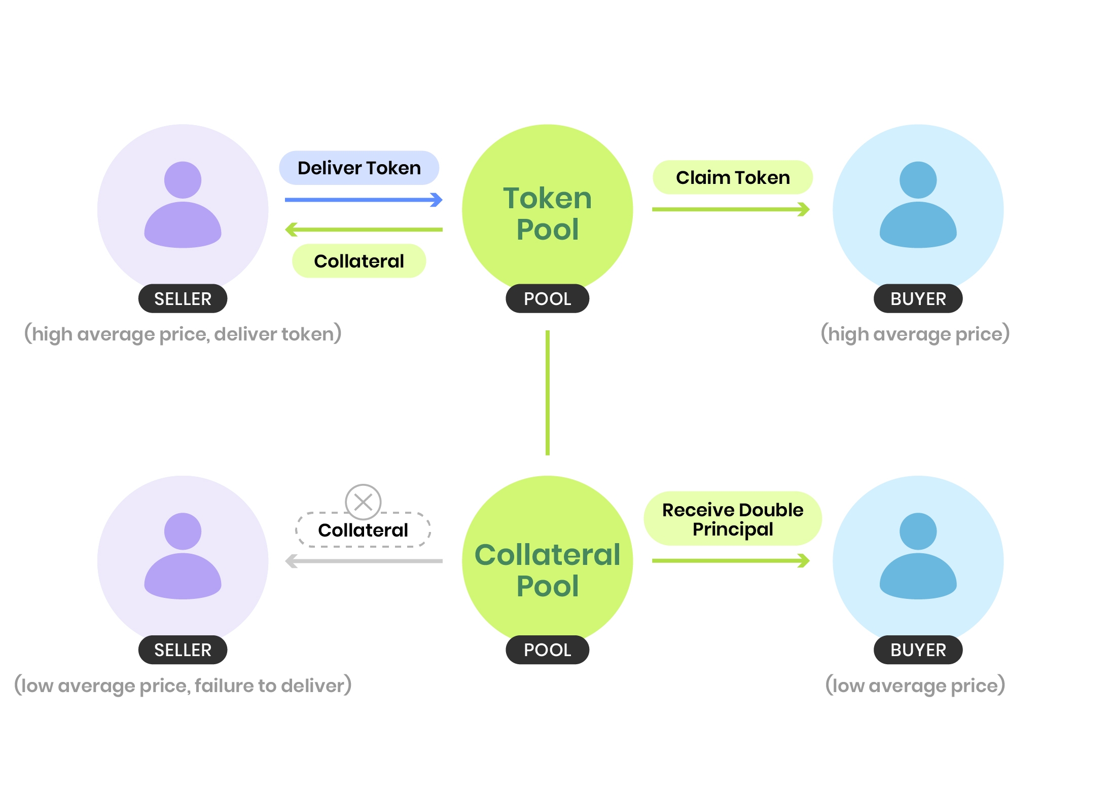 买方将收到卖方交付的 token,或者返还其本金以及卖方的抵押物作为补偿。根据买方的平均买入价格,价格越高,买方越可能收到卖方的抵押物;而价格越低,买方越可能获得补偿。