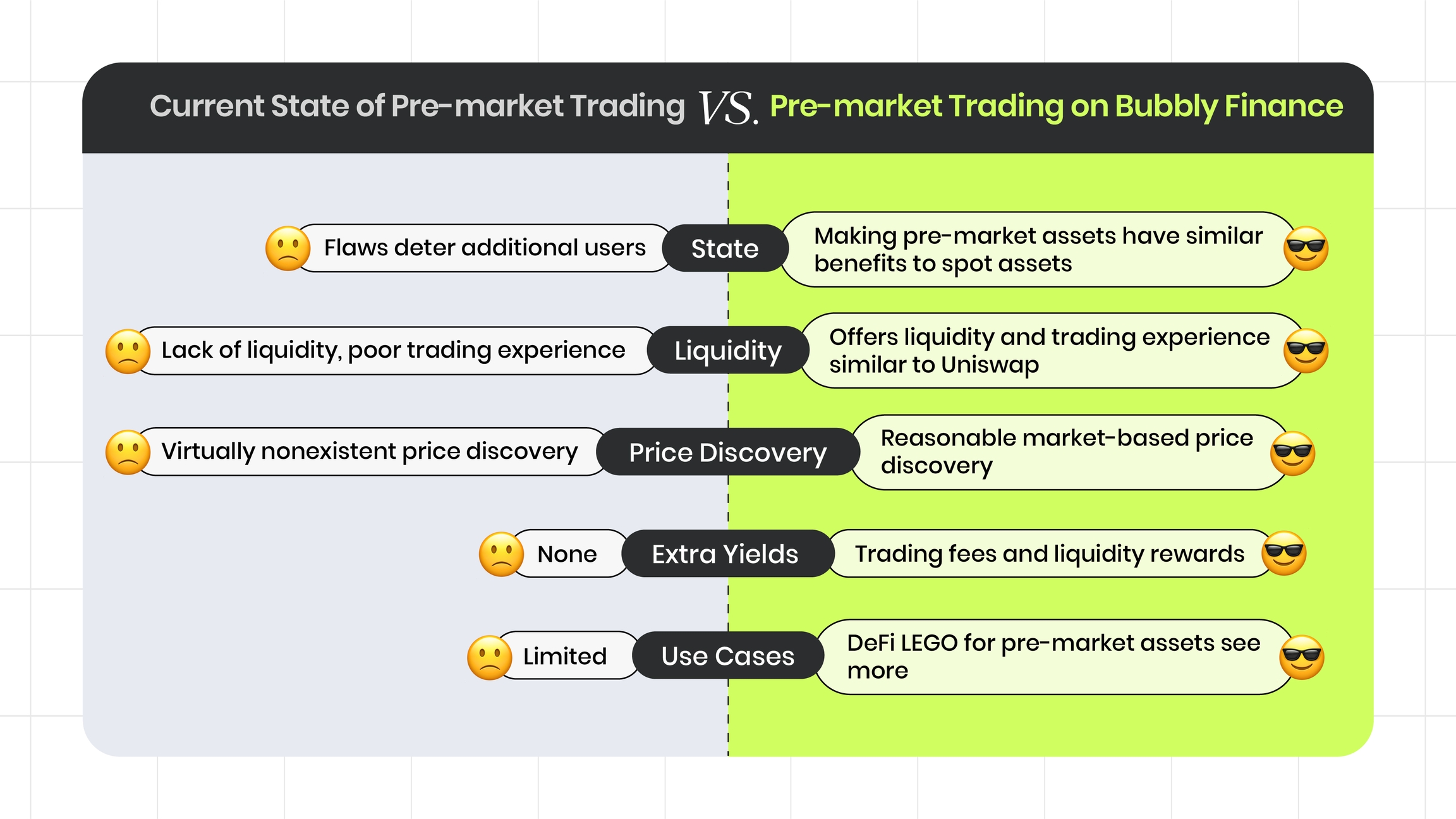 Bubbly Finance 解决了当前 pre-market 交易中的关键问题,将其转变为更强大且用户友好的体验。传统的 pre-market 充满了阻碍用户的缺陷,表现为流动性不足、交易体验差,以及几乎不存在价格发现机制。