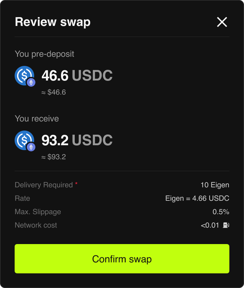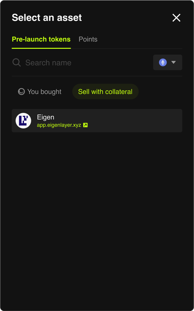 您可以提供抵押品来卖出从其他平台获得的 Pre-market 资产,在交割代币后,您将收到卖出的收益,并取回您的抵押品。